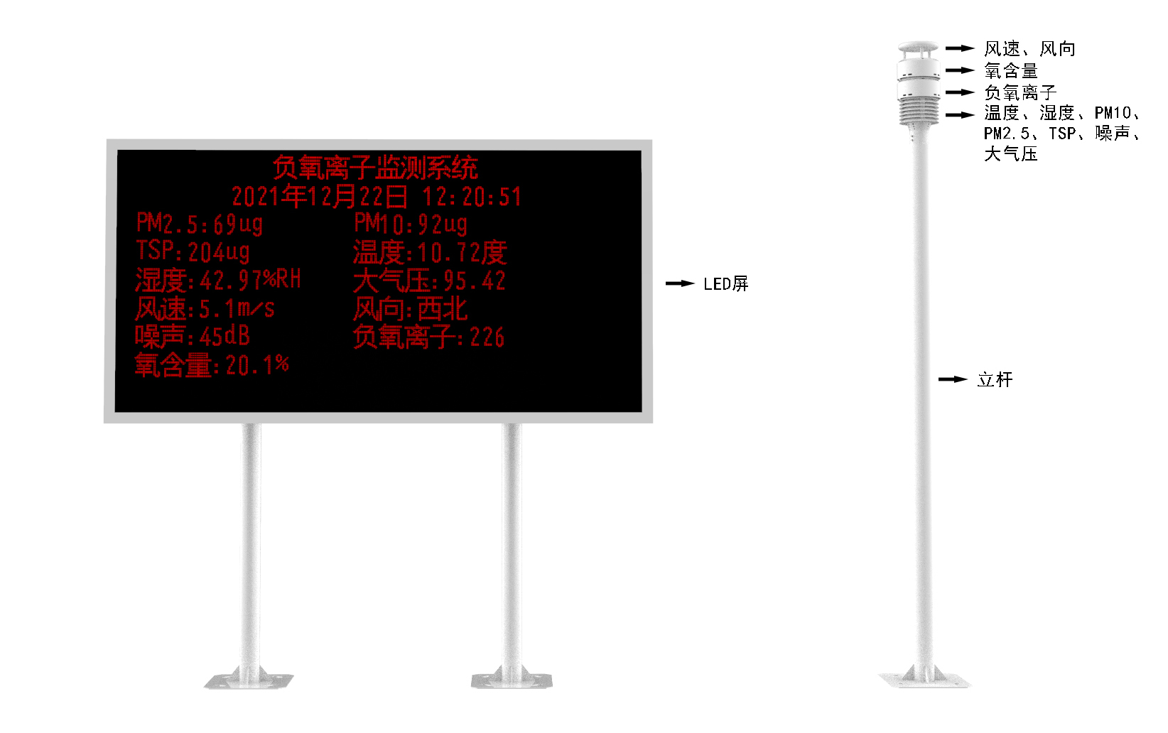 1、集成度高,方案灵活:系统可集成负氧离子、空气温度、空气湿度、PM2.5、PM10、大气压力、氧含量、噪声、风速、风向